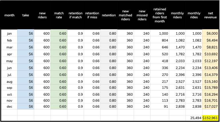 It stands to reason that there will be diminishing returns the longer we are in market. So let's cut new riders by about 10% for every subsequent monthly cohort and see how this changes the result.