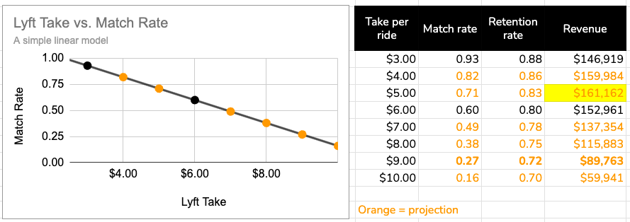 This is a super simplified linear model to project match rate. In fact, match rate might drop off a lot more steeply once we get past a $6 take rate, which would result in an optimal take rate closer to $6.