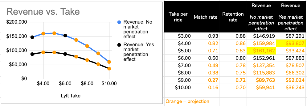 With this new model revenue peaks at $4. So it is fair to say that the optimal take rate for the business is between $4 and $5.