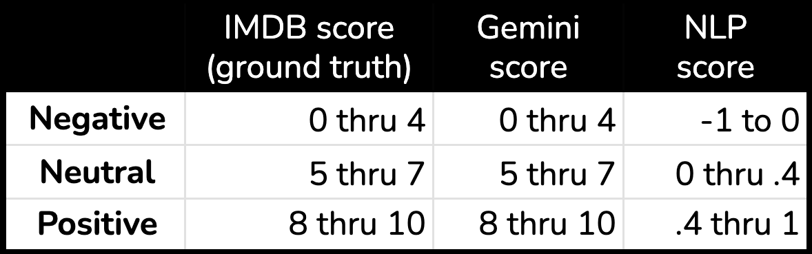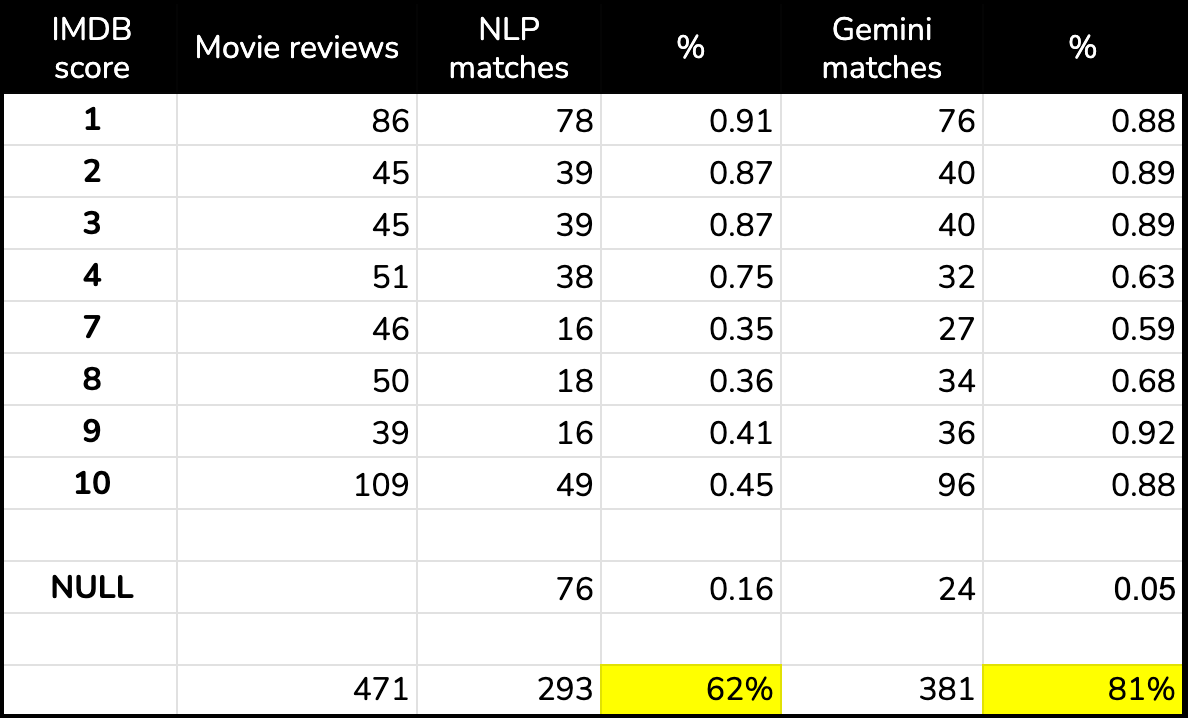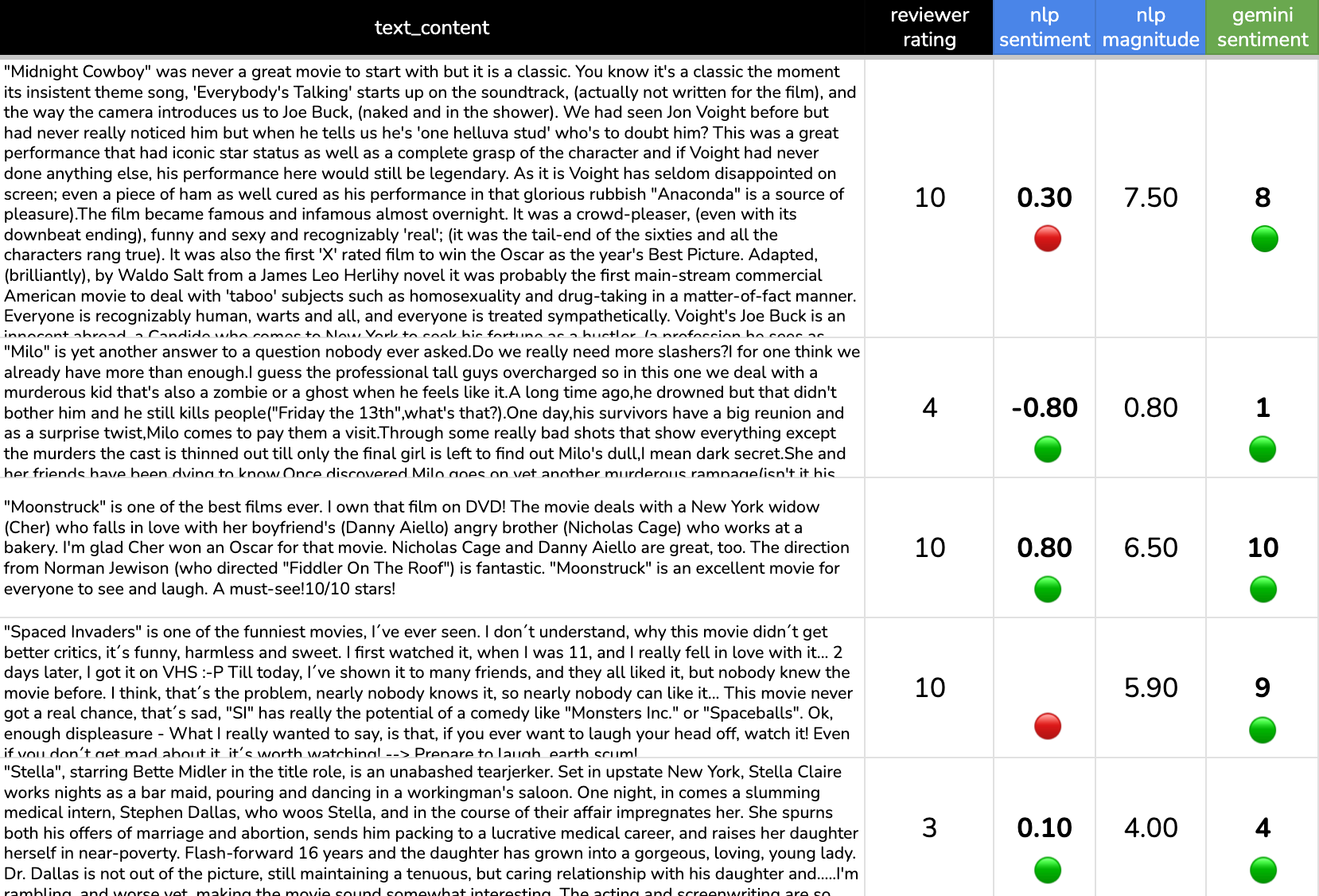 This sample of 5 looks pretty good! We see lots of green when comparing the ground truth rating provided by the reviewer to the results generated by the two AI models. Interestingly, it looks like Gemini might outperform the NLP API which scores the 10 / 10 Midnight Cowboy review with a negative sentiment and also failed to generate a response for the Spaced Invaders review.