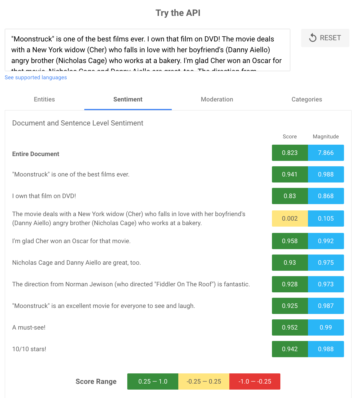 We can see how the NLP API works when we run a 10 / 10 Moonstruck review through the API demo: