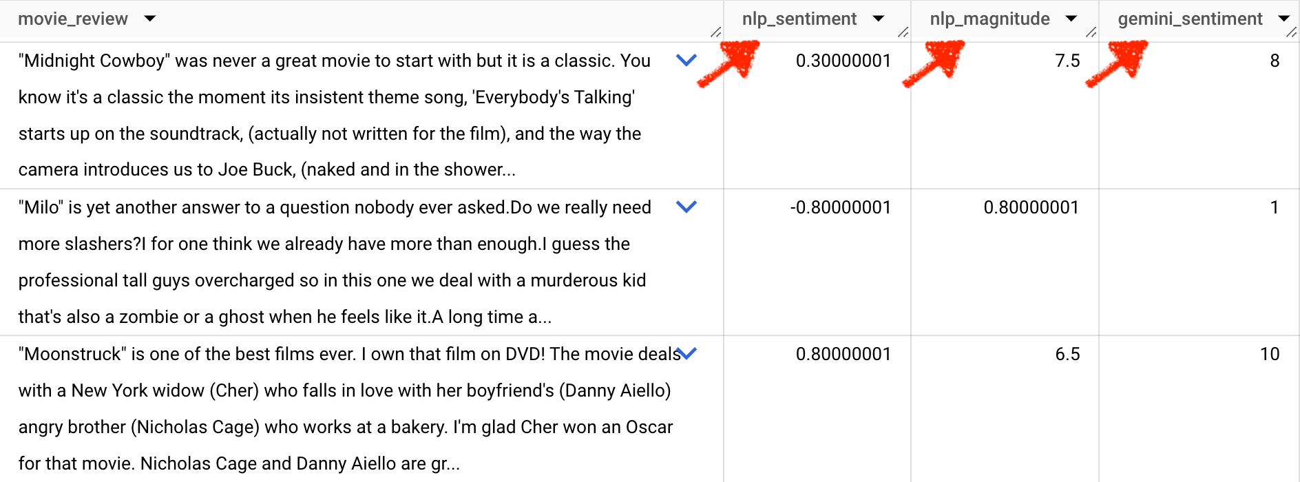 SELECT text_content, movie_url, label, reviewer_rating, sentiment_score nlp_sentiment, magnitude_score nlp_magnitude, ml_generate_text_llm_result gemini_sentiment, prompt gemini_prompt,